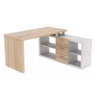 Su diseño en forma de “L” crea un espacio de trabajo ergonómico y cómodo, ideal para colocar laptop, libros, materiales escolares y accesorios de estudio. La base lateral integra tres cajones funcionales y cuatro compartimentos abiertos, perfectos para mantener todo ordenado y a la vista.